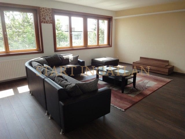EXCELLENT LAY-OUT, MANY SERVICES ON ONE PLACE! 140 sqm luxury flat for rent on 1st floor (elevator stops in the flat) in a 3-flat house, re-built in 2016. The apartment consists of a 46 sqm living room with a large terrace (access to the common swimming pool), 3 bedrooms, 2 bathrooms and an eat-in-kitchen. Beautiful view opens from the living room. There are common bar, safe, wellness part, swimming pool, fitness room, saunas, massage room, 24 hours doorman service, underground garage in the house. The play ground for the children is very safe. Floor-plan! THE RENTAL FEE CONTAINS THE UTILITIES! From January, 2026!